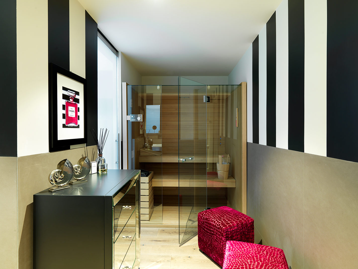 Pensata in ogni dettaglio, dall’arredo ai complementi, con uno stile unico, molto colto e decisamente elegante, esprime il carattere sofisticato e di ricerca dell’architetto che accosta il design contemporaneo con mobili intarsiati, velluti animaliere, citazioni etniche e riferimenti decò, mentre la palette di colori si ispira a timbri di toni caldi, con accenti turchesi e fucsia.